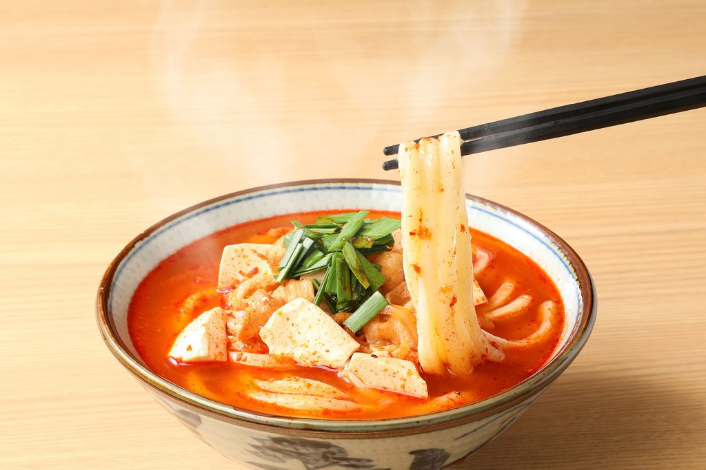 寒い日にぴったりな旨辛熱々のスンドゥブうどん。身体の芯から温まる一杯です。